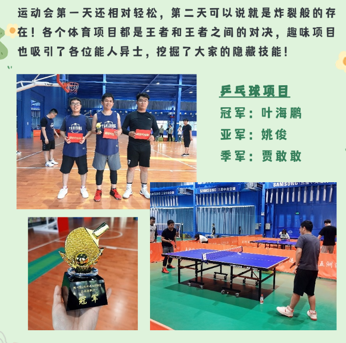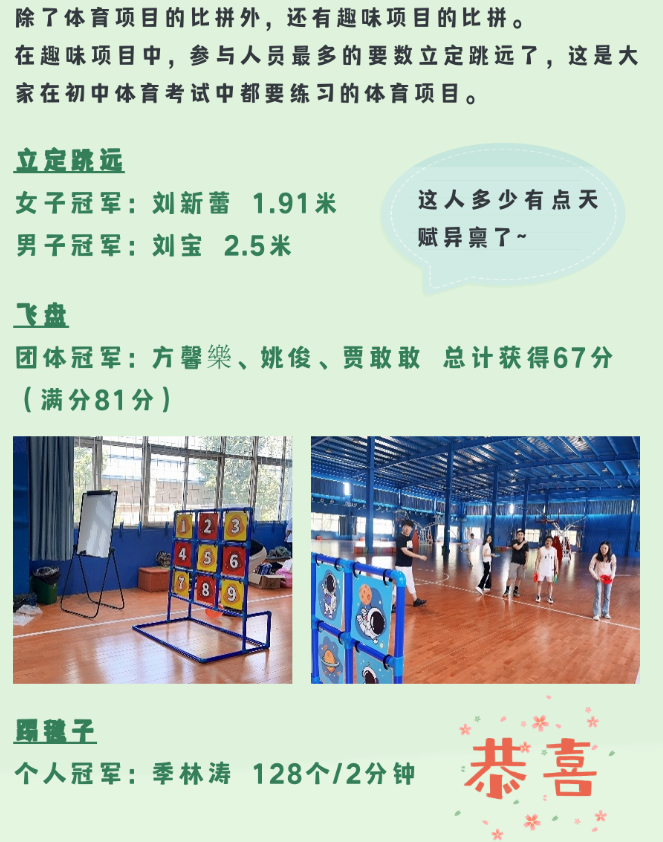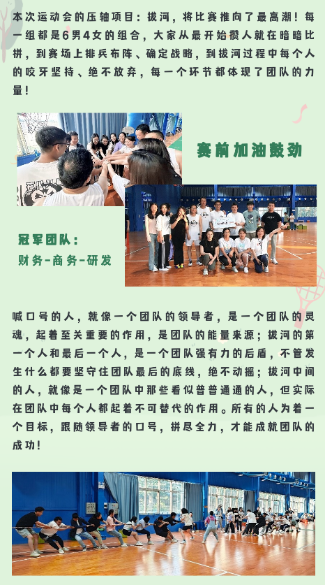 相信通過這次運(yùn)動(dòng)會(huì),大家在合作和對(duì)抗中都對(duì)其他人有了新的認(rèn)知,在未來的工作和生活中,能夠更加融洽更加默契!